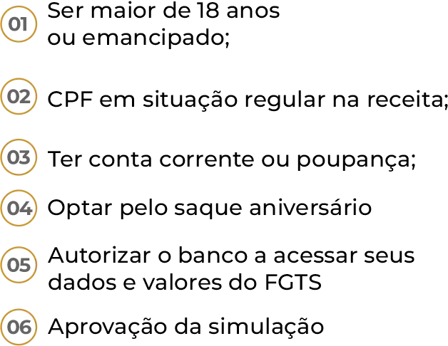 É necessário ter saldo ativo ou inativo na conta do FGTS, ser maior de 18 anos, ser optante pelo Saque-Aniversário (Caso não seja, entrar no app e optar pela alteração da modalidade) e chamar um de nossos atendentes para finalizar o processo.